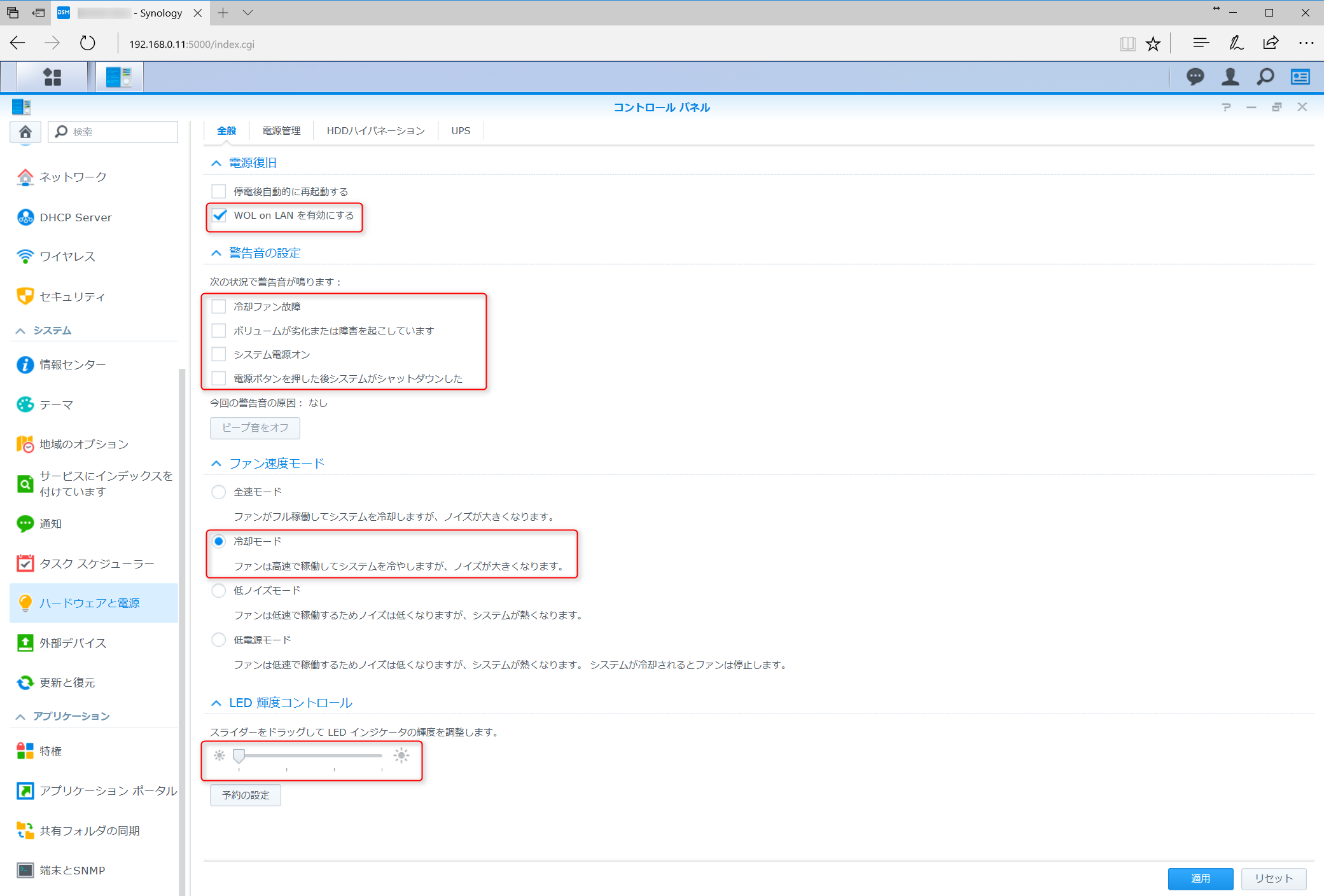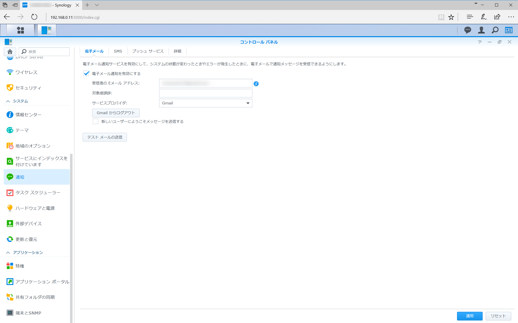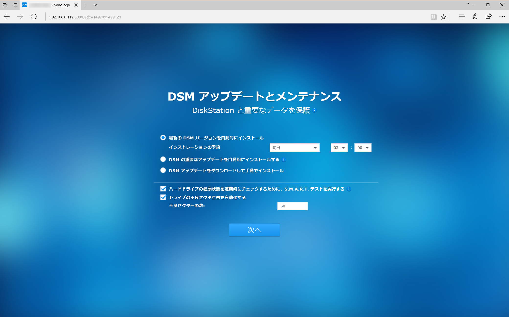 DSMのアップデートとメンテナンスの設定を行います. 個人利用なのか,業務利用なのか,日中利用なのか,夜間利用なのかによって変わってきますが,今回は個人的に日中利用するため「最新のDSMバージョンを自動的にインストール」「毎日:3時」の設定にしました.