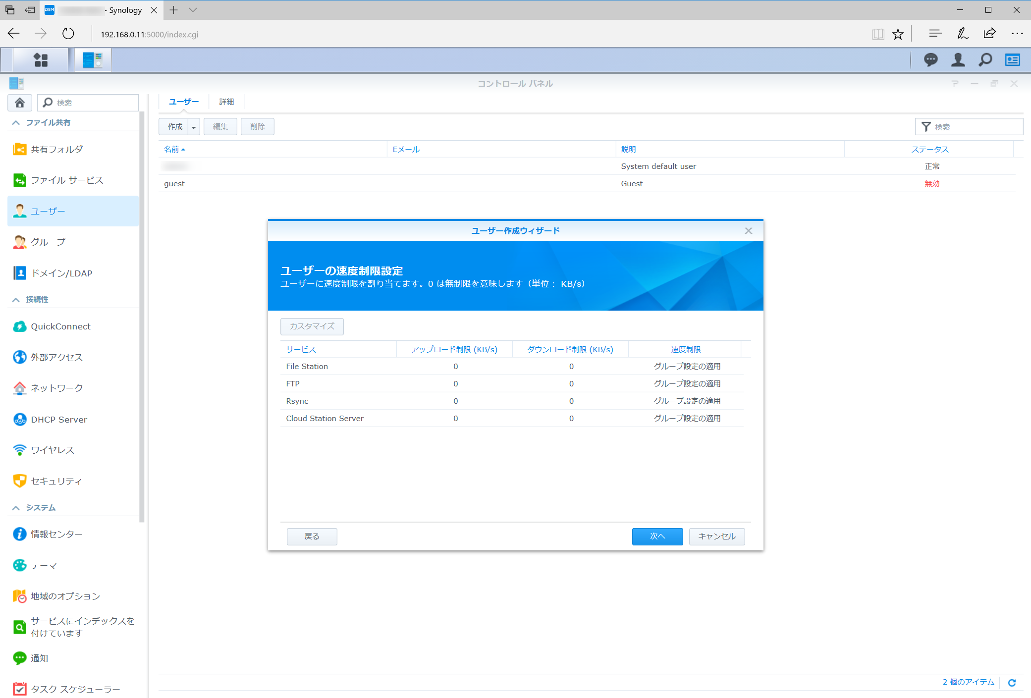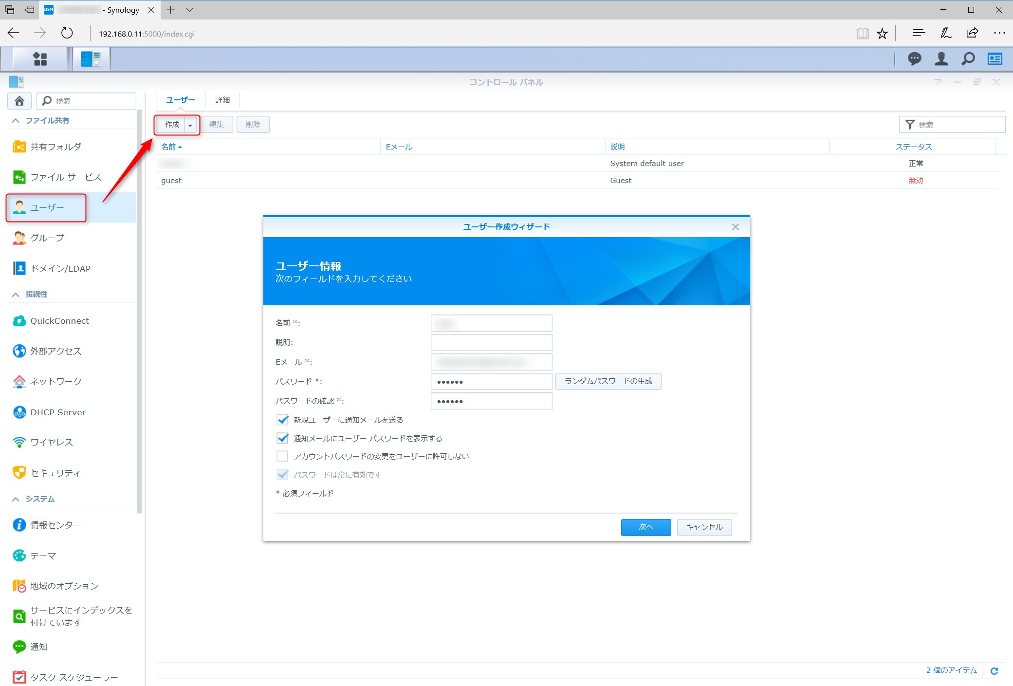 「ユーザー」→「作成」とクリックすると「ユーザー作成ウィザード」が始まります.