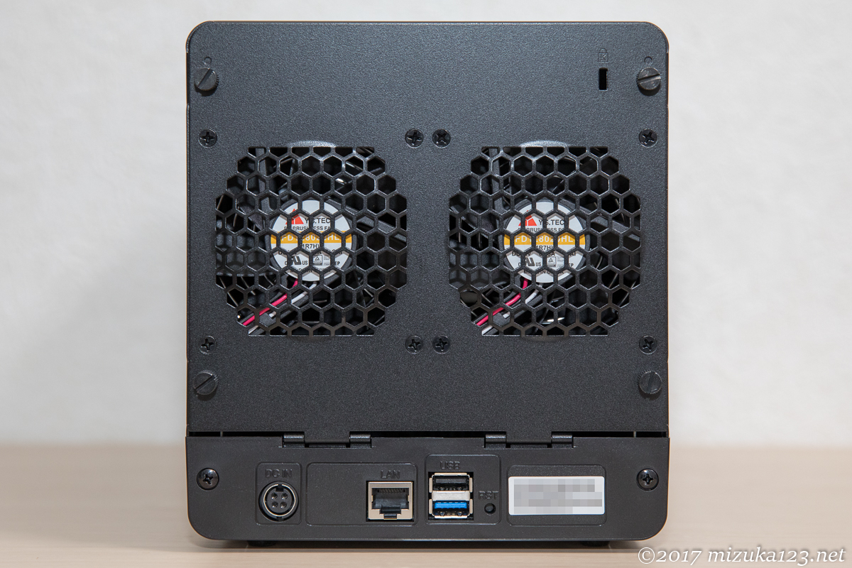 背面にはファンが2つあり廃熱性が確保されています. NICは1つ,USBは2.0と3.0がそれぞれ1つずつとなっています.
