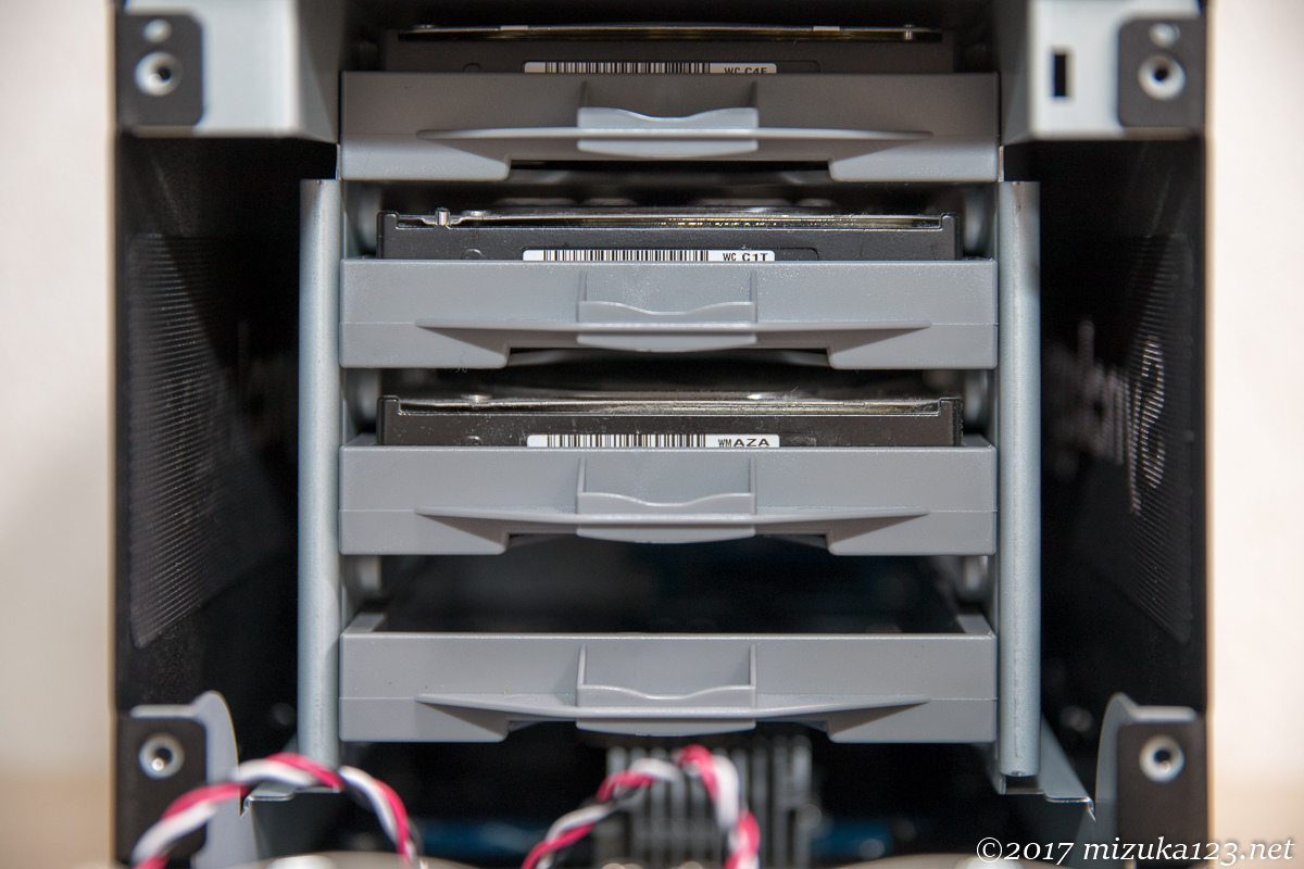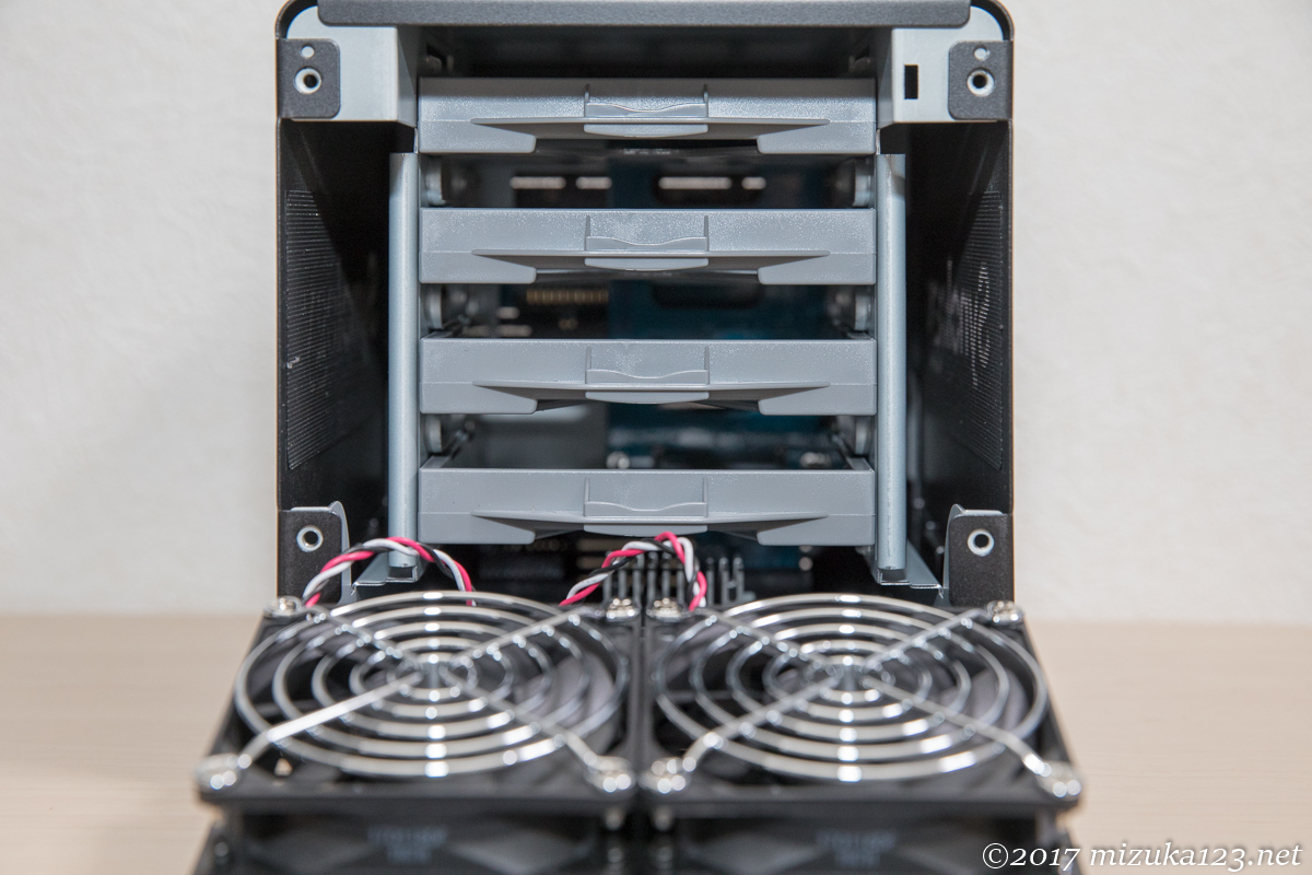 HDDの取付は背面から行います. 4辺のネジを外すとファンの部分が外れるので,中からHDDを固定する部品を取り出しHDDを取り付けていきます.